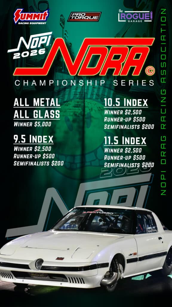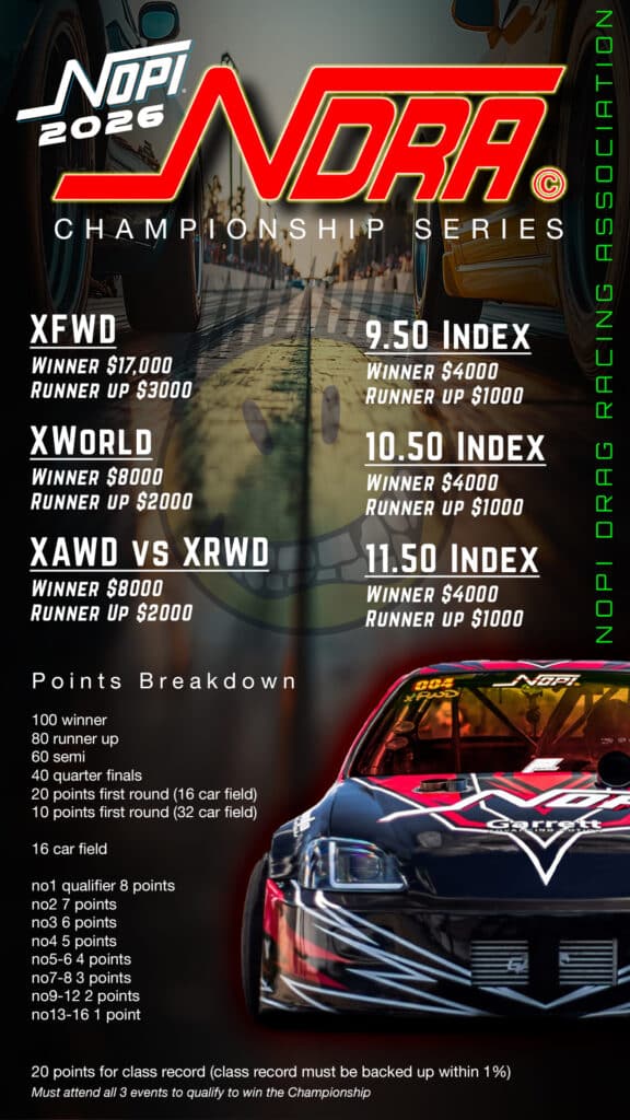 This page contains the complete rules and regulations for NOPI Drag Racing events. Use the table of contents to jump to your class, then review the requirements carefully before race day. All vehicles must comply with NHRA safety rules.